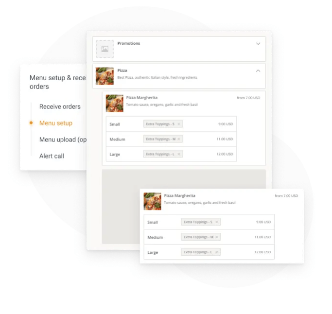 Ca parte a procesului de setare al restaurantului, generatorul mostru de meniuri online iti permite sa adaugi categorii si feluri de mancaruri delicioase, topping-uri, imagini si nu numai.